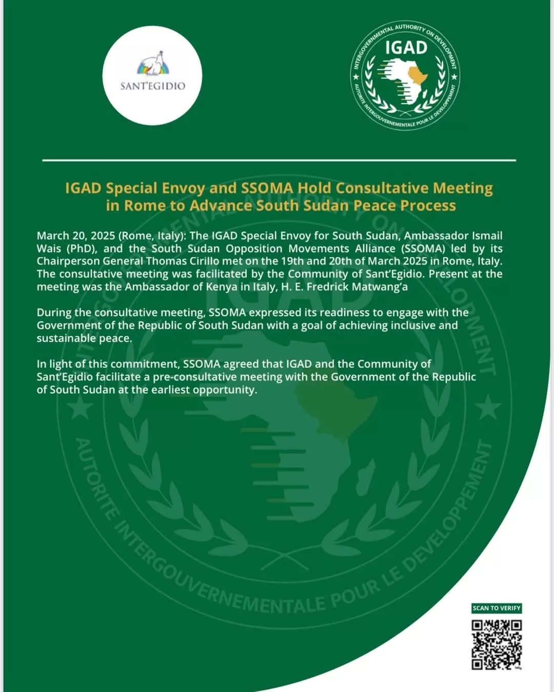 ROME (March 20, 2025) — A two-day consultative meeting between the South Sudan Opposition Movements Alliance (SSOMA) and the IGAD Special Envoy for South Sudan concluded on Wednesday in Rome, marking a step forward in renewed efforts for peace.
