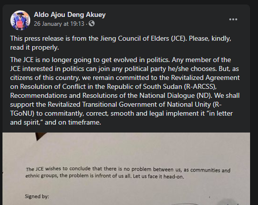 On January 26th 2021, the JCE – a self-proclaim Jieng (Dinka) lobby group – published a letter in which they said they “wish to break [their] long silence,” and wanted to “speak about the state of affairs in our country.” The letter tried to explain that the council – which was formed, in their own words, to “oversee the interest of the Jieng people”, has been widely misunderstood and they have are “a force for good of the country, not its destruction,” although they have been constantly “accused of pursuing a parochial interest to establish a state that only serves the interest of the Jieng people.”