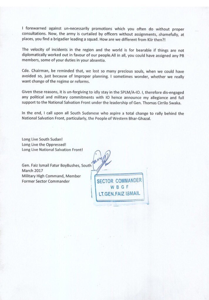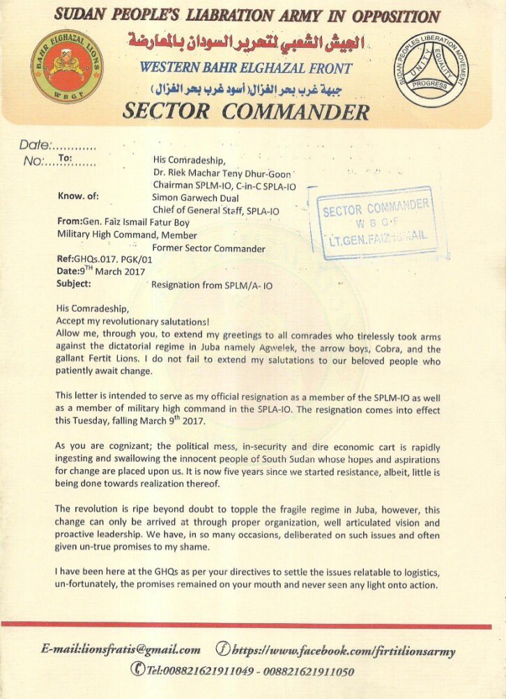 On March 9, 2017, Gen. Faiz, then a member of the SPLM-IO High Military Command and sector commander of the WBG front, made a historic decision. His resignation from SPLM-IO was accompanied by a candid listing of letdowns and failures within the organization and Riek Machar’s leadership (or the lack thereof). These grievances, as outlined by Gen. Faiz, resonated with the challenges faced by many, and some persist to this day.